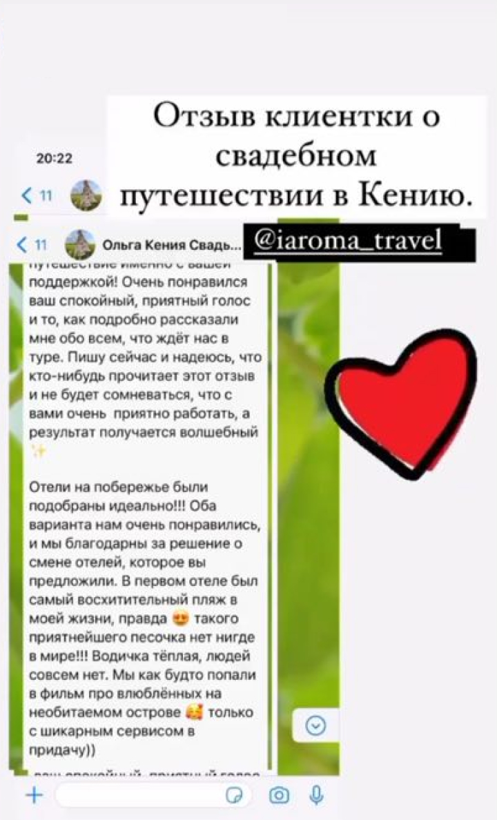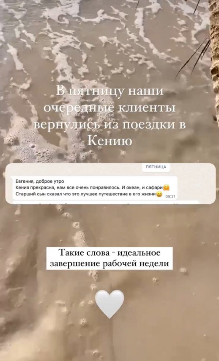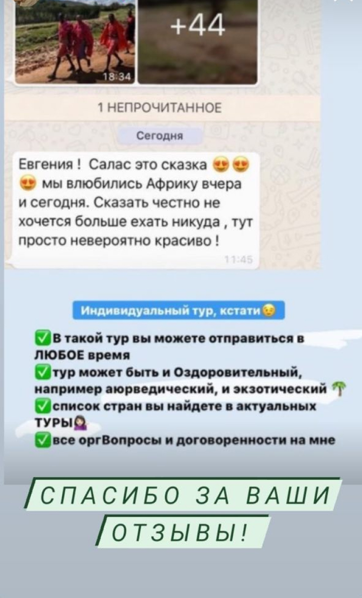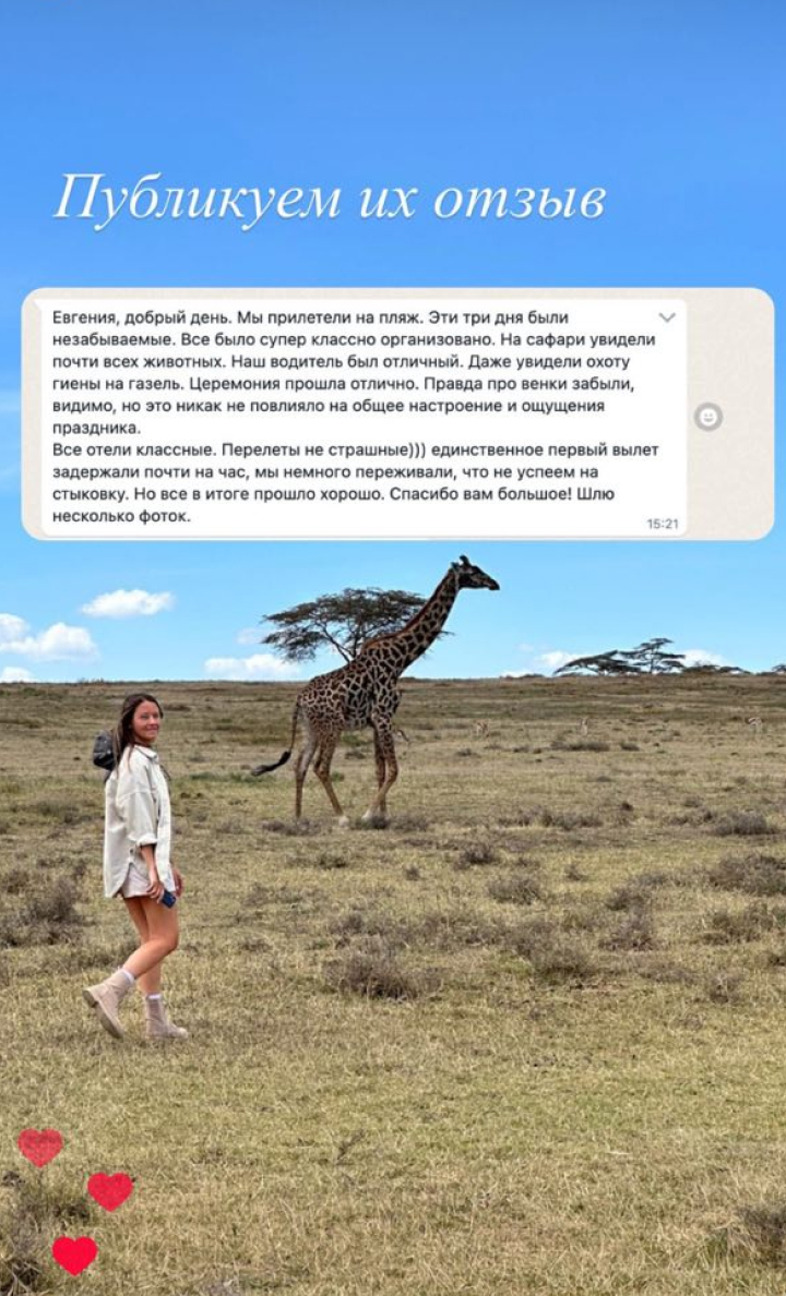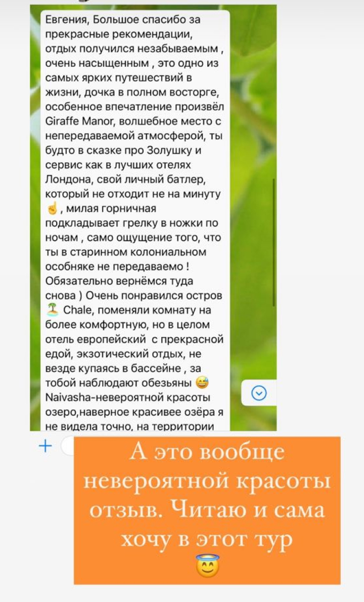 «Евгения, добрый день. Хотела бы выразить огромную благодарность за то, что организовали нашу самую лучшую в жизни поездку. Все было идеально сбалансировано, у нас столько эмоций, просто не передать словами. Я конечно ожидала от нее много, смотрела фотографии, но… (смотреть полностью)